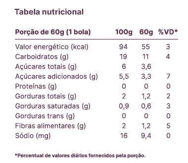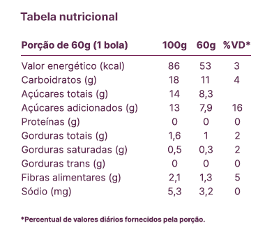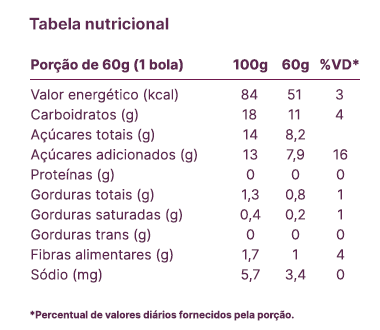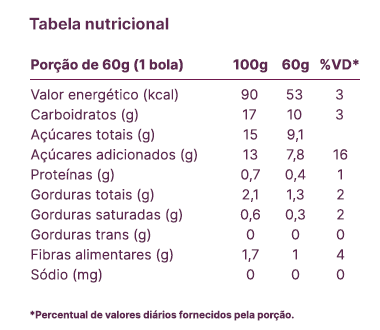 (*) Valores diários de referência com base em uma dieta de 2000kcal ou 8400kj. Seus valores diários podem ser maiores ou menores dependendo de suas necessidades energéticas.