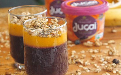 Deixe o pote de Juçaí descongelar por aproximadamente 10 minutos, em temperatura ambiente. Primeiro, dilua a gelatina em água fria, esquente até dissolver totalmente e reserve. No liquidificador, coloque a mistura com o Juçaí e a banana, e leve à geladeira por, pelo menos, 8 horas. Enquanto isso, bata o restante dos ingredientes – a manga, o maracujá e o gengibre – no liquidificador, e também deixe refrigerando. Na hora de servir, coloque essa calda de maracujá por cima da mousse, e finalize com granola e chia.