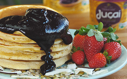 Misture os ingredientes secos – farinha, sal, fermento e açúcar – em uma tigela. Em uma outra tigela, misture os ingredientes líquidos – manteiga, ovos e leite. Depois, junte todos os ingredientes e mexa bem, até a massa ficar homogênea. Então, unte a frigideira e espere esquentar para colocar a massa. Quando surgirem as bolhas, vire a panqueca. Sirva com calda de Juçaí*.